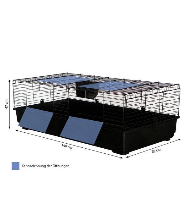 Jetzt ist es endlich soweit: Zwergkaninchen oder Meerschweinchen ziehen bei Ihnen ein und die Kinder sind schon ganz aufgeregt. Sicherlich haben Sie bereits Futter und ein bisschen Spielzeug besorgt. Dann komplettieren Sie die Grundausstattung gleich noch mit dem Dehner Nagerheim Peppy! Denn auch wenn geplant ist, die Tiere zum Spielen und Schmusen oft herauszunehmen, damit sie im Zimmer herumrennen können – ein richtiges „Haus“ brauchen sie schon. Mit seinen Maßen von 140 x 47 x 69 cm bietet das Dehner Nagerheim Peppy viel Bewegungsspielraum auch im Käfig, dient aber auch als sichere Rückzugsmöglichkeit für die Nacht oder das Nickerchen zwischendurch. Und was Ihnen gefallen wird: Mit diesem Käfig entscheiden Sie sich auch für ein Produkt in Dehner Markenqualität. Der Nagerkäfig besteht aus einem pulverbeschichteten Metallgitter mit einem Drahtabstand von 26 mm, die Unterschale ist aus Kunststoff. Geben Sie Ihren kleinen Haustieren ein Zuhause, in dem sie sich wohl fühlen werden: das Dehner Nagerheim Peppy!