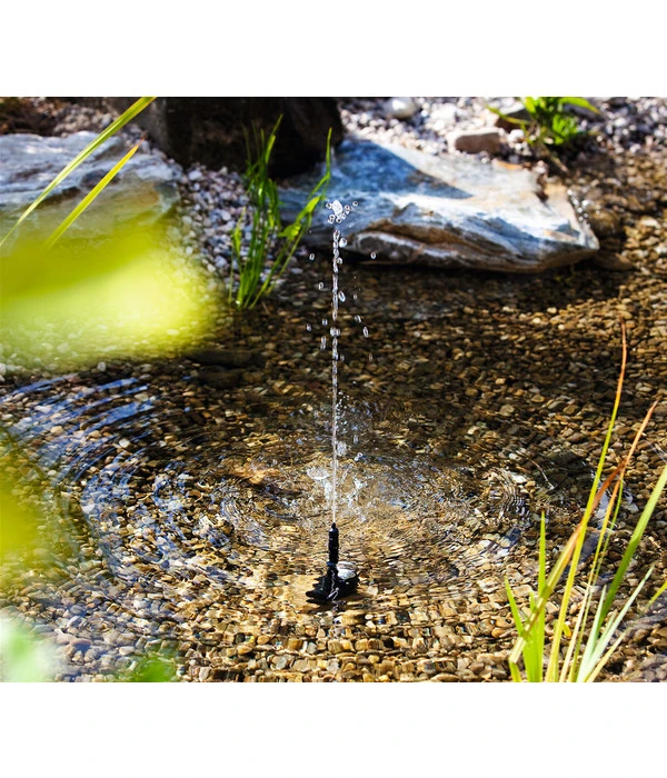 Wasser im Garten zaubert sofort eine wunderbar natürliche und entspannende Atmosphäre, in der man sich sofort wohl fühlt. Viele Gartenteichbesitzer schätzen es vor allem, wenn es sich nicht um ein ganz stilles Gewässer handelt, sondern wenn ein Wasserspeier oder ein anderes Wasserspiel für Bewegung und sanftes Wasserplätschern sorgt. Wenn auch Sie überlegen, Ihren Teich mit einem Wasserspiel zu beleben, dann brauchen Sie eine Pumpe, die das Wasser in die Höhe befördert, wie das Esotec Solarpumpensystem Rimini S. Das Esotec Solarpumpensystem Rimini S hat eine regulierbare Förderleistung von 175 l/h und ist in der Lage, ein Wasserspiel oder einen Wasserspeier bis 70 cm Höhe zu betreiben. Das Beste aber an der Esotec Solarpumpensystem Rimini S ist die Tatsache, dass es mit Solarenergie betrieben wird, also keinen Stromanschluss braucht. Das Kernstück des Esotec Solarpumpensystem Rimini S, die Pumpe selbst, ist langlebig und wartungsarm.