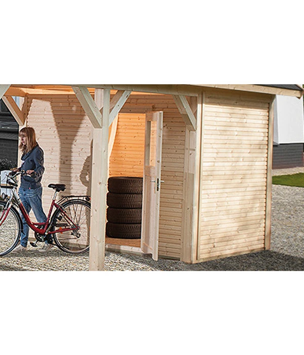 Carportlagerraum in stabiler Blockbohlenbauweise für Leimholz Flach- und Satteldach Gr. 2, Natur, aus Cubilisbohlen, 28 mm stark, bestehend aus 2 Seitenwänden, 1 Rückwand, 1 Frontwand + Tür